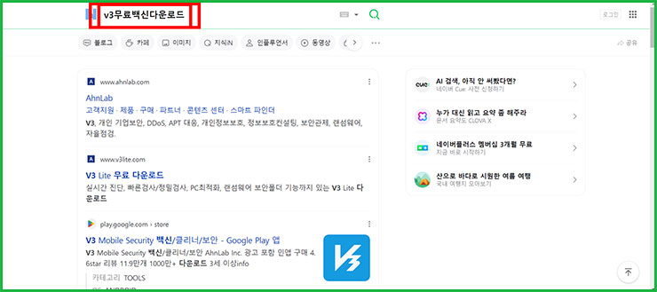 01. 네이버 검색창에 'v3 lite 무료 다운로드'를 검색해주세요. 바쁘신 분들을 위해서 위에 공식 사이트 링크를 걸어놓았습니다.