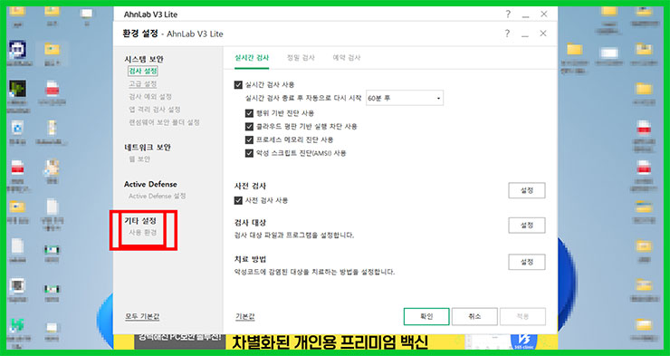 02. 좌측 탭을 확인해주세요. 시스템 보안 / 네트워크 보안 / Active Defense / 기타 설정에서 '기타 설정'으로 들어가주세요.