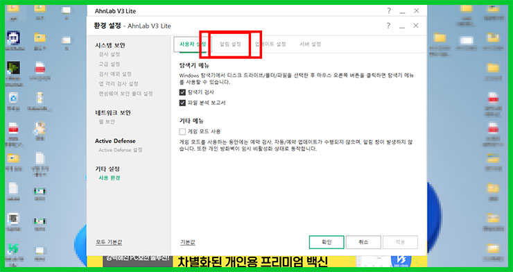 03. 사용자 설정 / 알림 설정 / 업데이트 설정 / 서버 설정이 나옵니다. 두 번째 위치한 '알람 설정'을 눌러주세요. 해당 탭에서 우리가 원하는 V3 광고 차단 제거를 할 수 있습니다.