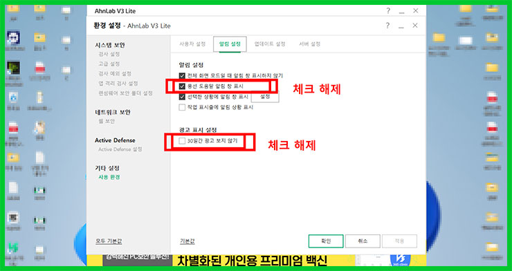 04. 총 두 가지에 체크 해제를 해야 합니다. 첫 번째는 '풍선 도움말 알림 창 표시'에 체크를 해제해주세요. 그리고 '30일간 광고보지 않기'에 체크 해제를 해주세요. 체크가 아닌 '체크 해제'입니다.