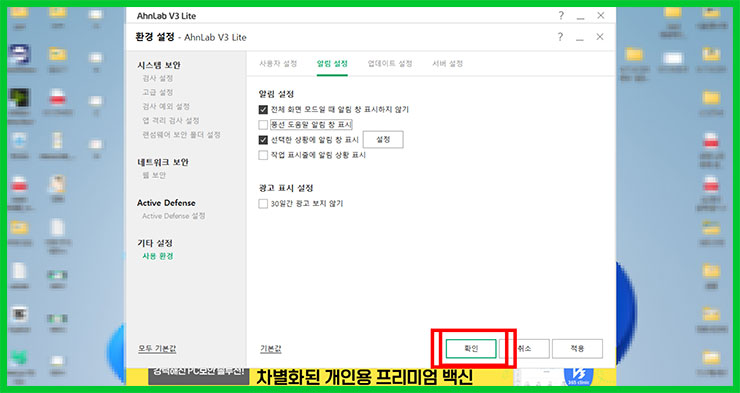 05. 두 가지 설정에 체크 해제를 했으면 우측 하단에 있는 '확인'을 눌러주세요. 그리고 X자를 눌러서 V3 프로그램을 꺼주세요. 안전하게 확인하기 위해서 다시 설정에 들어가서 체크가 잘 풀려있는지 확인하면 좋습니다. 체크 해제했다고 생각했는데 안 된 경우가 종종 있습니다.